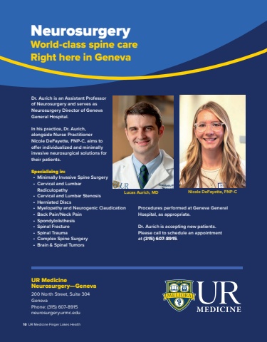 Dr. Aurich is an Assistant Professorof Neurosurgery and serves asNeurosurgery Director of GenevaGeneral Hospital.In his practice, Dr. Aurich,alongside Nurse PractitionerNicole DeFayette, FNP-C, aims too%u008fer individualized and minimallyinvasive neurosurgical solutionstheir patients.Specializing in:%u2022 Minimally Invasive Spine Surgery%u2022Cervical and LumbarRadiculopathy%u2022Cervical and Lumbar Stenosis%u2022Herniated Discs%u2022Myelopathy and Neurogenic Claudication%u2022Back Pain/Neck Pain%u2022Spondylolisthesis%u2022 Spinal Fracture%u2022 Spinal Trauma%u2022Complex Spine Surgery%u2022Brain & Spinal TumorsProcedures performed at Geneva GeneralHospital, as appropriate.Dr. Aurich is accepting new patients.Please call to schedule an appointmentat(315) 607-8915.NeurosurgeryWorld-class spine careRight here in GenevaUR MedicineNeurosurgery%u2014Geneva200 North Street, Suite 304GenevaPhone: (315) 607-8915neurosurgery.urmc.edu10 UR Medicine Finger Lakes Health