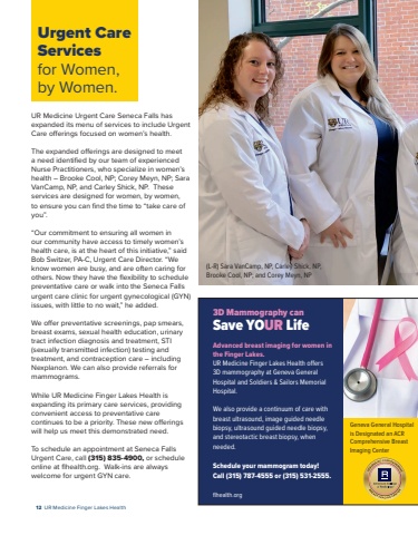 12 UR Medicine Finger Lakes HealthUrgent CareServicesfor Women,by Women.UR Medicine Urgent Care Seneca Falls hasexpanded its menu of services to include UrgentCare o%u0082erings focused on women%u2019s health.The expanded o%u0082erings are designed to meeta need identified by our team of experiencedNurse Practitioners, who specialize in women%u2019shealth %u2013 Brooke Cool, NP; Corey Meyn, NP; SaraVanCamp, NP, and Carley Shick, NP. Theseservices are designed for women, by women,to ensure you can find the time to %u201ctake care ofyou%u201d.%u201cOur commitment to ensuring all women inour community have access to timely women%u2019shealth care, is at the heart of this initiative,%u201d saidBob Switzer, PA-C, Urgent Care Director. %u201cWeknow women are busy, and are often caring forothers. Now they have the flexibility to schedulepreventative care or walk into the Seneca Fallsurgent care clinic for urgent gynecological (GYN)issues, with little to no wait,%u201d he added.We o%u0082er preventative screenings, pap smears,breast exams, sexual health education, urinarytract infection diagnosis and treatment, STI(sexually transmitted infection) testing andtreatment, and contraception care %u2013 includingNexplanon. We can also provide referrals formammograms.While UR Medicine Finger Lakes Health isexpanding its primary care services, providingconvenient access to preventative carecontinues to be a priority. These new o%u0082eringswill help us meet this demonstrated need.To schedule an appointment at Seneca FallsUrgent Care, call(315) 835-4900, or scheduleonline at flhealth.org. Walk-ins are alwayswelcome for urgent GYN care.3D Mammography canSave YOUR LifeAdvanced breast imaging for womenthe Finger Lakes.UR Medicine Finger Lakes Health o%u0091ers3D mammography at Geneva GeneralHospital and Soldiers & Sailors MemorialHospital.We also provide a continuum of care withbreast ultrasound, image guided needlebiopsy, ultrasound guided needle biopsy,and stereotactic breast biopsy, whenneeded.Schedule your mammogram today!Call (315) 787-4555 or (315) 531-2555.flhealth.orgComprehensive BreastImaging Center(L-R) Sara VanCamp, NP, Carley Shick, NP,Brooke Cool, NP; and Corey Meyn, NP