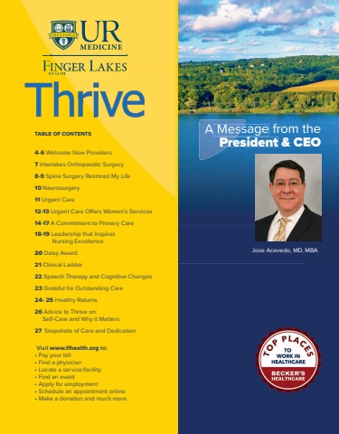 2 UR Medicine Finger Lakes HealthA Message from thePresident & CEOTABLE OF CONTENTS4-6Welcome New Providers7 Interlakes Orthopaedic Surgery8-9Spine Surgery Restored My Life10Neurosurgery11Urgent Care12-13 Urgent Care O%u0082ers Women%u2019s Services14-17A Commitment to Primary Care Nursing Excellence20 Daisy Award21 Clinical Ladder22Speech Therapy and Cognitive Changes23 Grateful for Outstanding Care24- 25Healthy Returns26Advice to Thrive on: Self-Care and Why it Matters27 Snapshots of Care and DedicationVisitwww.flhealth.org to:%u2022 Pay your bill%u2022 Find a physician%u2022 Locate a service/facility%u2022 Find an event%u2022 Apply for employment%u2022 Schedule an appointment online%u2022 Make a donation and much moreA MessagePresident