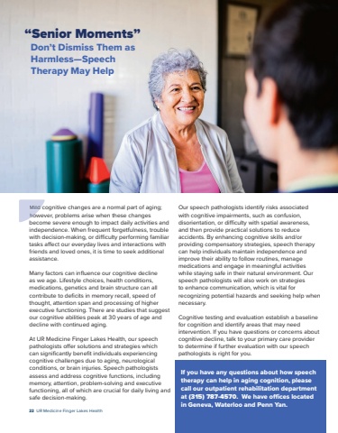 22 UR Medicine Finger Lakes HealthMild cognitive changes are a normal part of aging;however, problems arise when these changesbecome severe enough to impact daily activities andindependence. When frequent forgetfulness, troublewith decision-making, or di%u0099culty performing familiartasks a%u0082ect our everyday lives and interactions withfriends and loved ones, it is time to seek additionalassistance.Many factors can influence our cognitive declineas we age. Lifestyle choices, health conditions,medications, genetics and brain structure can allcontribute to deficits in memory recall, speed ofthought, attention span and processing of higherexecutive functioning. There are studies that suggestour cognitive abilities peak at 30 years of age anddecline with continued aging.At UR Medicine Finger Lakes Health, our speechpathologists o%u0082er solutions and strategies whichcan significantly benefit individuals experiencingcognitive challenges due to aging, neurologicalconditions, or brain injuries. Speech pathologistsassess and address cognitive functions, includingmemory, attention, problem-solving and executivefunctioning, all of which are crucial for daily living andsafe decision-making.Our speech pathologists identify risks associatedwith cognitive impairments, such as confusion,disorientation, or di%u0099culty with spatial awareness,and then provide practical solutions to reduceaccidents. By enhancing cognitive skills and/orproviding compensatory strategies, speech therapycan help individuals maintain independence andimprove their ability to follow routines, managemedications and engage in meaningful activitieswhile staying safe in their natural environment. Ourspeech pathologists will also work on strategiesto enhance communication, which is vital forrecognizing potential hazards and seeking help whennecessary.Cognitive testing and evaluation establish a baselinefor cognition and identify areas that may needintervention. If you have questions or concerns aboutcognitive decline, talk to your primary care providerto determine if further evaluation with our speechpathologists is right for you.If you have any questions about how speechtherapy can help in aging cognition, pleasecall our outpatient rehabilitation departmentat(315) 787-4570. We have o%u008cces locatedin Geneva, Waterloo and Penn Yan.%u201cSenior Moments%u201dDon%u2019t Dismiss Them asHarmless%u2014SpeechTherapy May HelpMild cognitivehowever,