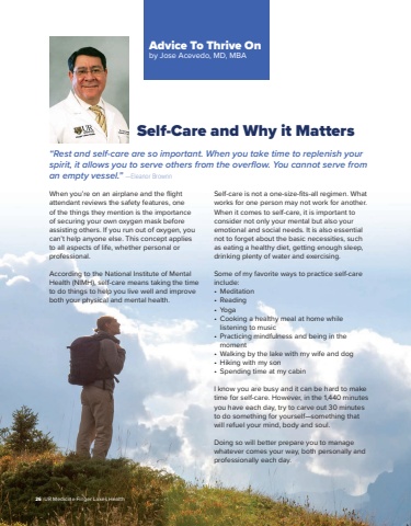 Advice To Thrive Onby Jose Acevedo, MD, MBASelf-Care and Why it Matters%u201cRest and self-care are so important. When you take time to replenish your spirit, it allows you to serve others from the overflow. You cannot serve from an empty vessel.%u201d %u2014Eleanor BrownnWhen you%u2019re on an airplane and the flight attendant reviews the safety features, one of the things they mention is the importance of securing your own oxygen mask before assisting others. If you run out of oxygen, you can%u2019t help anyone else. This concept applies to all aspects of life, whether personal or professional.According to the National Institute of Mental to do things to help you live well and improve both your physical and mental health.Self-care is not a one-size-fits-all regimen. What works for one person may not work for another.When it comes to self-care, it is important to consider not only your mental but also your emotional and social needs. It is also essential not to forget about the basic necessities, such as eating a healthy diet, getting enough sleep, drinking plenty of water and exercising.Some of my favorite ways to practice self-care %u2022 Meditation%u2022 Reading%u2022 Yoga%u2022 Cooking a healthy meal at home while listening to music%u2022 Practicing mindfulness and being in the moment%u2022 Walking by the lake with my wife and dog%u2022 Hiking with my son%u2022 Spending time at my cabinI know you are busy and it can be hard to make time for self-care. However, in the 1,440 minutes you have each day, try to carve out 30 minutes to do something for yourself%u2014something that will refuel your mind, body and soul.Doing so will better prepare you to manage whatever comes your way, both personally and professionally each day. 26 UR Medicine Finger Lakes Health