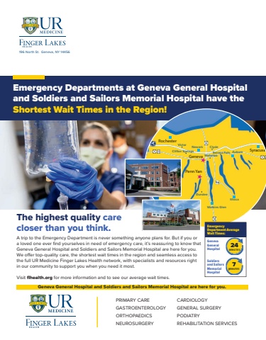 196 North St. Geneva, NY 14456Geneva General Hospital and Soldiers and Sailors Memorial Hospital are here for you.PRIMARY CAREGASTROENTEROLOGYORTHOPAEDICSNEUROSURGERYCARDIOLOGYGENERAL SURGERYPODIATRYREHABILITATION SERVICEScloser than youA trip to the Emergency Department is never something anyone plans for. But if you ora loved one ever find yourselves in need of emergency care, it%u2019s reassuring to know thatGeneva General Hospital and Soldiers and Sailors Memorial Hospital are here for you.We o%u0082er top-quality care, the shortest wait times in the region and seamless access tothe full UR Medicine Finger Lakes Health network, with specialists and resources rightin our community to support you when you need it most.Visitflhealth.org for more information and to see our average wait times.Emergency Departments at Geneva General Hospitaland Soldiers and Sailors Memorial Hospital have theShortest Wait Times in the Region!RochesterSyracusePennClydeSeneca FallsNewarkClifton SpringsAuburnVictorGenevaWaterlooIthacaWatkins GlenEmergencyDepartment AverageWait Times:GenevaGeneralHospitalSoldiersand SailorsMemorialHospital24MINUTES7MINUTES