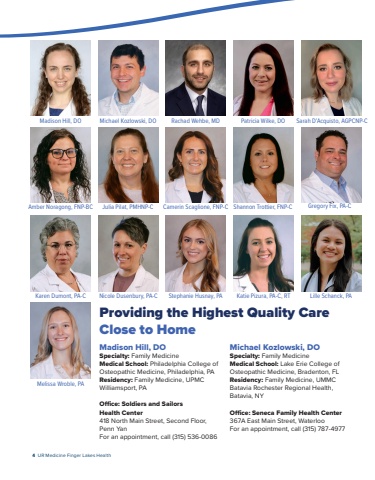 4 UR Medicine Finger Lakes HealthMadison Hill, DOSpecialty: Family MedicineMedical School: Philadelphia College of Osteopathic Medicine, Philadelphia, PAResidency: Family Medicine, UPMC Williamsport, PAO%u008cce: Soldiers and Sailors Health Center418 North Main Street, Second Floor, Penn YanFor an appointment, call (315) 536-0086Michael Kozlowski, DO Specialty: Family MedicineMedical School: Lake Erie College of Osteopathic Medicine, Bradenton, FLResidency: Family Medicine, UMMC Batavia Rochester Regional Health, Batavia, NYO%u008cce: Seneca Family Health Center367A East Main Street, WaterlooFor an appointment, call (315) 787-4977Providing the Highest Quality CareClose to HomeMadison Hill, DO Michael Kozlowski, DO Rachad Wehbe, MD Patricia Wilke, DO Sarah D%u2019Acquisto, AGPCNP-C Amber Noragong, FNP-BC Julia Pilat, PMHNP-C Camerin Scaglione, FNP-CShannon Trottier, FNP-CGregory Fix, PA-CKaren Dumont, PA-C Nicole Dusenbury, PA-C Stephanie Husnay, PA Katie Pizura, PA-C, RT Lille Schanck, PA Melissa Wroble, PA