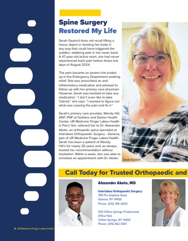 Spine SurgeryRestored My LifeSarah Gaylord does not recall lifting aheavy object or twisting her body inany way that could have triggered thesudden, stabbing pain in her lower back.A 47-year-old active mom, she had neverexperienced back pain before those lastdays of August 2024.The pain became so severe she endedup in the Emergency Department seekingrelief. She was prescribed an antiinflammatory medication and advised tofollow up with her primary care physician.However, Sarah was hesitant to take anymedication. %u201cI don%u2019t even like to takeTylenol,%u201d she says. %u201cI wanted to figure outwhat was causing the pain and fix it.%u201dSarah%u2019s primary care provider, Wendy Hill,ANP, PNP at Soldiers and Sailors HealthCenter, UR Medicine Finger Lakes Healthin Penn Yan, referred her to Dr. AlexanderAkoto, an orthopedic spine specialist atInterlakes Orthopaedic Surgery - Geneva,part of UR Medicine Finger Lakes Health.Sarah has been a patient of WendyHill%u2019s for nearly 30 years and, as always,trusted her recommendation withouthesitation. Within a week, she was able toschedule an appointment with Dr. Akoto.Alexander Akoto, MDInterlakes Orthopaedic Surgery789 Pre-Emption RoadGeneva, NY 14456Phone: (315) 789-0993430 Clifton Springs ProfessionalO%u0095ce ParkClifton Springs, NY 14432Phone: (315) 462-3501 HealthCall Today for Trusted Orthopaedic