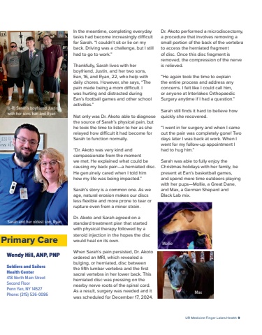UR Medicine Finger Lakes HealthIn the meantime, completing everydaytasks had become increasingly di%u0003cultfor Sarah. %u201cI couldn%u2019t sit or lie on myback. Driving was a challenge, but I stillhad to go to work.%u201dThankfully, Sarah lives with herboyfriend, Justin, and her two sons,Ean, 16, and Ryan, 22, who help withdaily chores. However, she says, %u201cThepain made being a mom di%u0003cult. Iwas hurting and distracted duringEan%u2019s football games and other schoolactivities.%u201dNot only was Dr. Akoto able to diagnosethe source of Sarah%u2019s physical pain, buthe took the time to listen to her as sherelayed how di%u0003cult it had become forSarah to function normally.%u201cDr. Akoto was very kind andcompassionate from the momentwe met. He explained what could becausing my back pain%u2014a herniated disc.He genuinely cared when I told himhow my life was being impacted.%u201dSarah%u2019s story is a common one. As weage, natural erosion makes our discsless flexible and more prone to tear orrupture even from a minor strain.Dr. Akoto and Sarah agreed on astandard treatment plan that startedwith physical therapy followed by asteroid injection in the hopes the discwould heal on its own.When Sarah%u2019s pain persisted, Dr. Akotoordered an MRI, which revealed abulging, or herniated, disc betweenthe fifth lumbar vertebra and the firstsacral vertebra in her lower back. Thisherniated disc was pressing on thenearby nerve roots of the spinal cord.As a result, surgery was needed and itwas scheduled for December 17, 2024.Dr. Akoto performed a microdiscectomy,a procedure that involves removing asmall portion of the back of the vertebrato access the herniated fragmentof disc. Once this disc fragment isremoved, the compression of the nerveis relieved.%u201cHe again took the time to explainthe entire process and address anyconcerns. I felt like I could call him,or anyone at Interlakes OrthopaedicSurgery anytime if I had a question.%u201dSarah still finds it hard to believe howquickly she recovered.%u201cI went in for surgery and when I cameout the pain was completely gone! Twodays later I was back at work. When Iwent for my follow-up appointment Ihad to hug him.%u201dSarah was able to fully enjoy theChristmas holidays with her family, bepresent at Ean%u2019s basketball games,and spend more time outdoors playingwith her pups%u2014Mollie, a Great Dane,and Max, a German Shepard andBlack Lab mix.Wendy Hill, ANP, PNPSoldiers and SailorsHealth Center418 North Main StreetSecond FloorPenn Yan, NY 14527Phone: (315) 536-0086(L-R) Sarah%u2019s boyfriend Justin,with her sons Ean and RyanMollieMax Primary Care